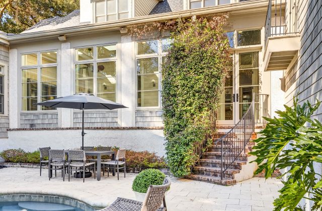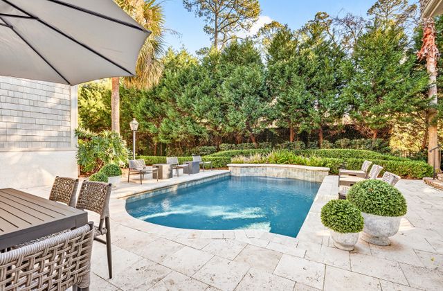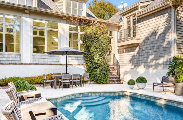 - Serene private pool (heatable in colder months) with lush landscaping, lots of seating, gas grill, and outdoor dining table with umbrella