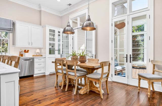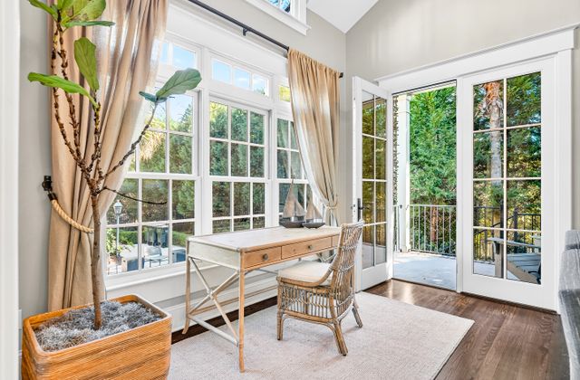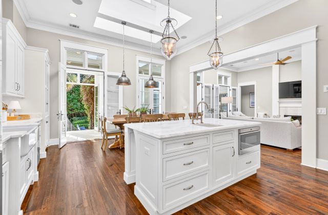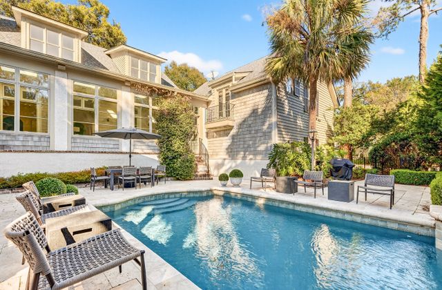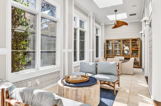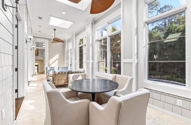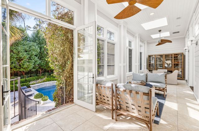 - Light-filled Carolina Room off kitchen and living area with comfy seating, game table, and views of back yard/pool area