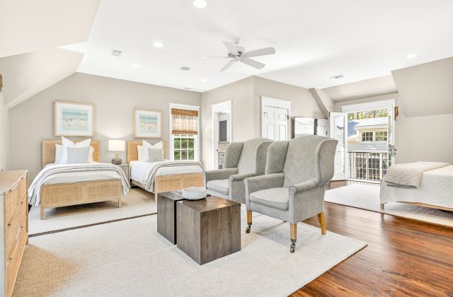 - Spacious family suite above garage is outfitted with a king bed and 2 twins, plus TV/living area, balcony, and multiple closets