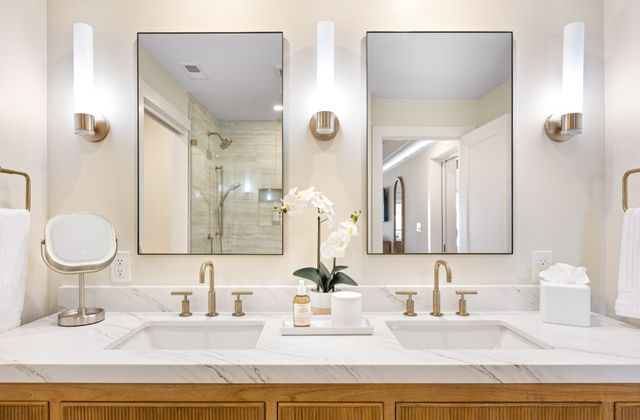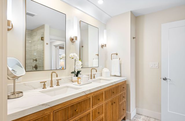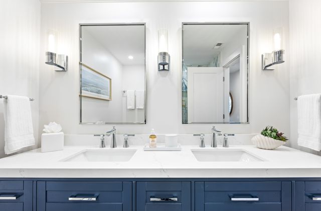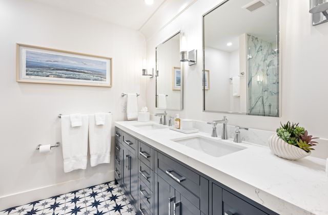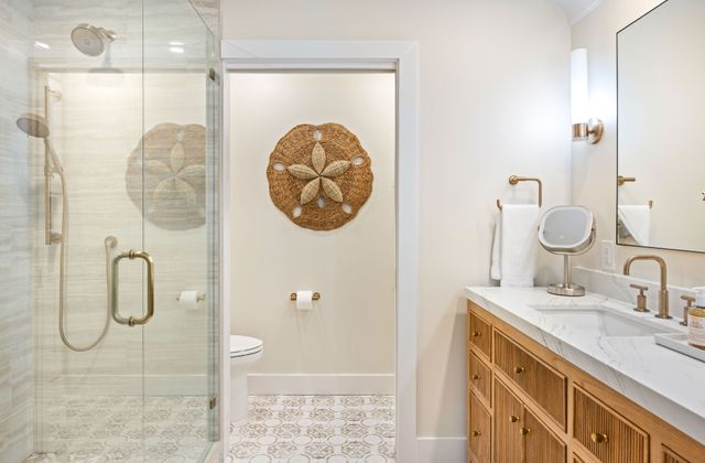Two bedrooms (1 King, 2 Queens) each boast the comfiest bed linens we could find, with fluffy pillows as well as all digital TV, and each features en suite bath, both of which are just beautiful!