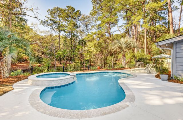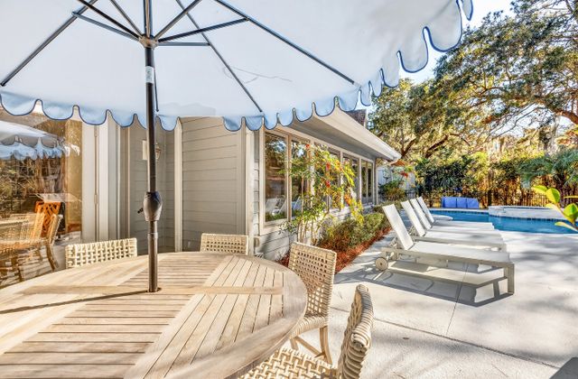 - The newly resurfaced private pool and spa area features lounge chairs, a gas grill, and poolside dining area. Pool is heatable in cooler months.