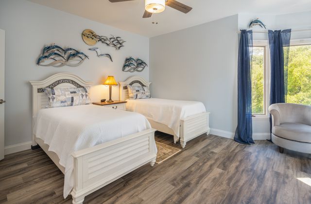 - Sleeping includes 4 bedrooms (1 king, 1 king, 1 queen, and 2 twins), each with en suite or adjacent bath.